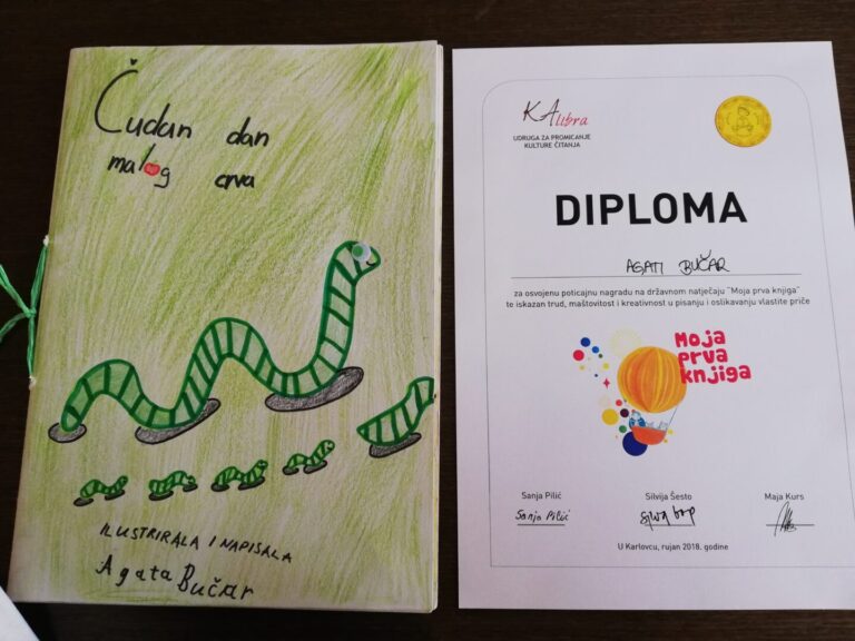 Udruga za promicanje kulture čitanja „KAlibra“ održala je 14. po redu natječaj „Moja prva knjiga“. Iako je natječaj završio prošle školske godine u svibnju, završna svečanost održana je 27. rujna 2018. u Domu HV Zrinski u Karlovcu. Ovaj državni natječaj provodi se pod pokroviteljstvom Ministarstva znanosti i obrazovanja, a sastoji se u pisanju i ilustriranju vlastite priče, a glavna nagrada je tiskanje najboljih radova. Među 726 prijavljenih slikovnica , našle su se i slikovnice naših učenika: Joze Juraja Brkića, Agate Bučar, Larise Dill, Toni Međić i Eve Supanc. Sadašnji četvrtaši (4.a), marljivo su izrađivali slikovnice prošle školske godine na boravku. Naše spisateljice Sanja Pilić i Silvija Šesto prepoznale su njihov rad. Za uložen trud, maštovitost i kreativnost u pisanju i oslikavanju vlastite priče nagrađeni su priznanjima i pohvalnicama. Među njima posebno se istaknula slikovnica Agate Bučar: Čudan dan malog crva, koja je osvojila poticajnu nagradu.